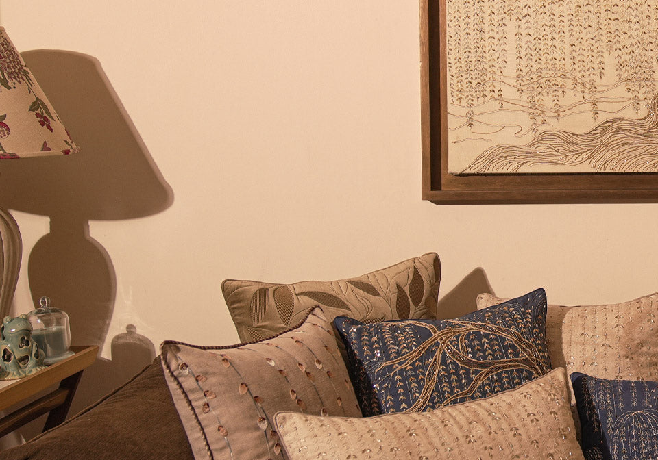 Where the wall study examined suspended descent at architectural scale, Sava explores how vertical articulation and restrained shimmer operate within softer, domestic formats. Zari and glass bead embroidery are introduced with measured control, allowing reflection to remain atmospheric rather than assertive.